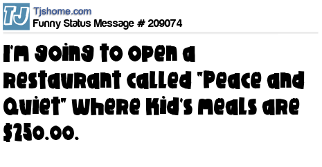 - # 159535 I'm going to open a restaurant called "Peace and Quiet" where kids meals cost $150.