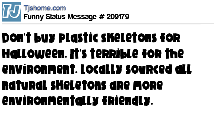 X is Don't buy plastic skeletons for Halloween. It's terrible for the environment. Locally sourced all natural skeletons are more environmentally friendly.