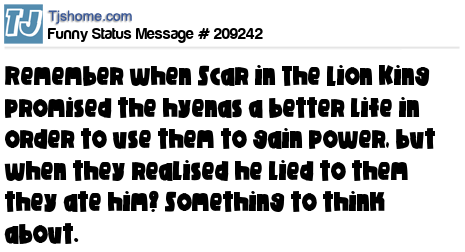 X says Remember when Scar in The Lion King promised the hyenas a better life in order to use them to gain power, but when they realised he lied to them they ate him? Something to think about.