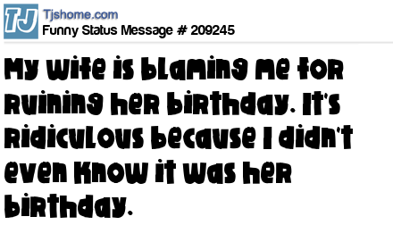 X is My wife is blaming me for ruining her birthday. It's ridiculous because I didn't even know it was her birthday.