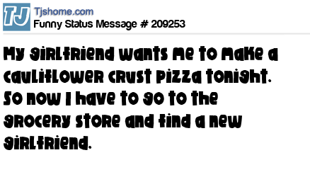 X says My girlfriend wants me to make a cauliflower crust pizza tonight. So now I have to go to the grocery store and find a new girlfriend.