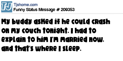 X is My buddy asked if he could crash on my couch tonight. I had to explain to him I'm married now, and that's where I sleep.