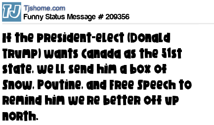 - # 209357 Canada, the 51st state? Sorry, Donnie, but we’re too busy sipping Tim Hortons and enjoying universal healthcare to join the circus.