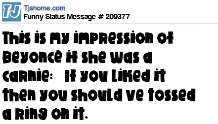 X says This is my impression of Beyoncé if she was a carnie: “If you liked it then you should’ve tossed a ring on it.”