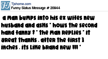 X says a man bumps into his ex wifes new husband and asks " hows the second hand fanny ? " the man replies " it great thanks , after the first 3 inches , its like brand new !!! "