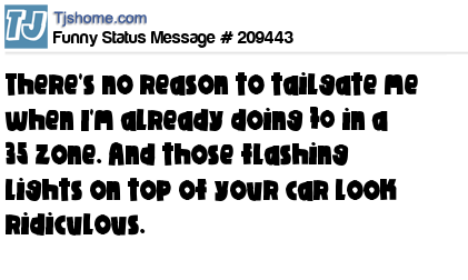 - # 153263 There is no reason to tail gate someone in the slow lane. Especially when I'm going 35MPH over the posted speed limit. Oh and those flashy little lights on top your car look ridiculous. SMH