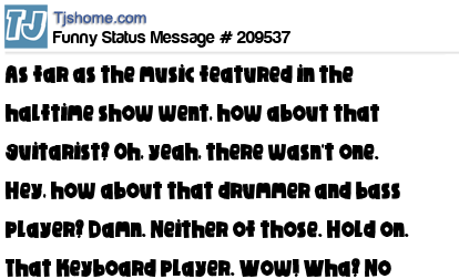 X says As far as the music featured in the halftime show went, how about that guitarist? Oh, yeah, there wasn't one. Hey, how about that drummer and bass player? Damn. Neither of those. Hold on. That keyboard player. Wow! Wha? No keyboar