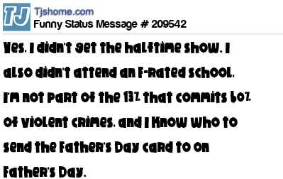 X says Yes, I didn't get the halftime show. I also didn't attend an F-rated school, I'm not part of the 13% that commits 60% of violent crimes, and I know who to send the Father's Day card to on Father's Day.