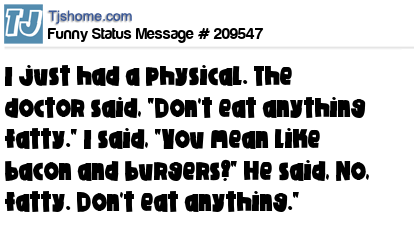 X says I just had a physical. The doctor said, "Don't eat anything fatty." I said, "You mean like bacon and burgers?" He said, No, fatty. Don't eat anything."