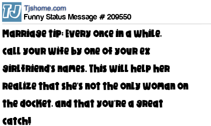 - # 209513 Marriage tip: Every once in a while, call your wife by one of your ex-girlfriend's names. This will help her realize that she is not the only woman on the docket, and that you're a really good catch!