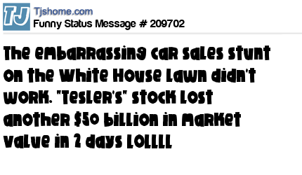 X is The embarrassing car sales stunt on the White House lawn didn't work. "Tesler's" stock lost another $50 billion in market value in 2 days LOLLLL