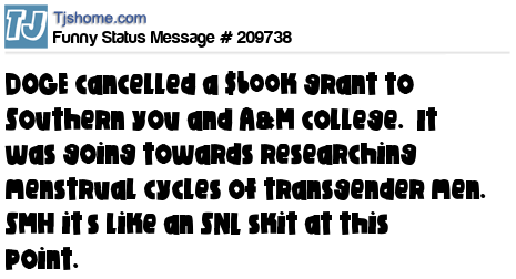 X is DOGE cancelled a $600k grant to Southern you and A&M college. It was going towards researching menstrual cycles of transgender men. SMH it’s like an SNL skit at this point.