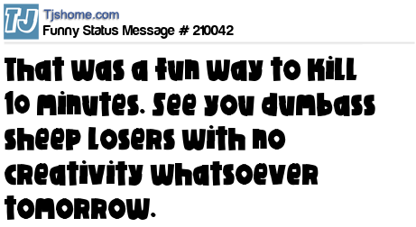 X is That was a fun way to kill 10 minutes. See you dumbass sheep losers with no creativity whatsoever tomorrow.