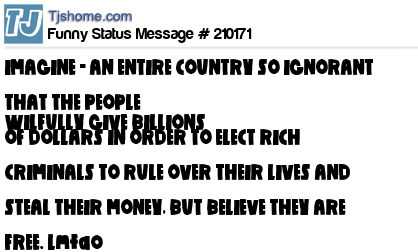 WILFULLY GIVE BILLIONS OF DOLLARS IN ORDER TO ELECT RICH CRIMINALS TO RULE OVER THEIR LIVES AND STEAL THEIR MONEY, BUT BELIEVE THEY ARE FREE. Lmfao