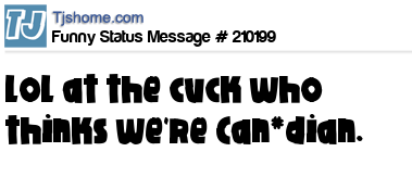 - # 210198 LOL at the cuck who thinks we're Can*dian. And hot tip - when you're bl*wing someone? And you let go of it for a moment? That's not a mic drop. That's a d*ck drop. You're not very good at this are you?