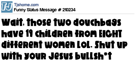 - # 210233 Those two douchbags have 19 children from 7 different women. Shut up with your Jesus bullsh*t.