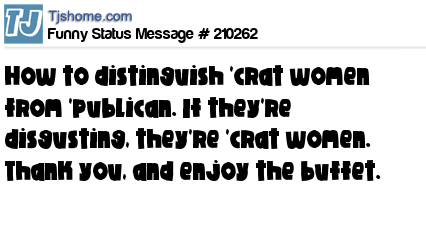 - # 210264 How to distinguish 'publican women from 'crat. If they're fat and stupid, they're 'publican women. Thank you, and enjoy watching your wife enjoy her third trip to the buffet table.