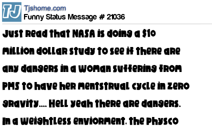 X is just read that NASA is doing a $10 million dollar study to see if there are any dangers in a woman suffering from PMS to have her mentstrual cycle in zero gravity.... Hell yeah there are dangers. In a weightless enviorment, the physco b!tches can FLY