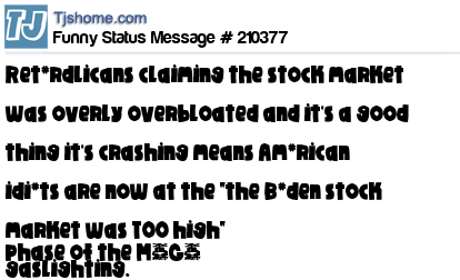 - # 210376 Retardlicans claiming the stock market was overly overbloated and it's a good thing it's crashing means Am*rican idi*ts are now at the "the B*den stock market was TOO high" phase of the M^G^ gaslighting.