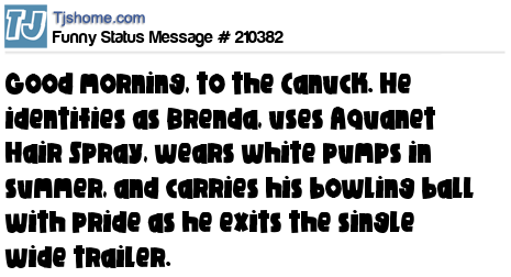X says Good morning, to the Canuck. He identifies as Brenda, uses Aquanet Hair Spray, wears white pumps in summer, and carries his bowling ball with pride as he exits the single wide trailer.