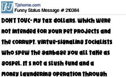 - # 210383 HANDS OFF - my tax dollars, which were not intended for your pet projects and the corrupt, virtue-signaling Socialists who spew the garbage you all take as gospel. It’s not a slush fund and a money laundering operation through left-wing NGO's to make po