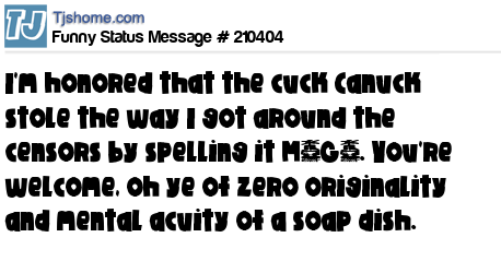 X says I'm honored that the cuck Canuck stole the way I got around the censors by spelling it M^G^. You're welcome, oh ye of zero originality and mental acuity of a soap dish.
