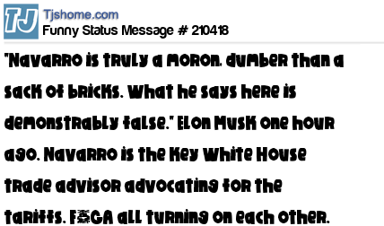 - # 210417 "Navarro is truly a moron. What he says here is demonstrably false." Elon Musk one hour ago. Navarro is the key White House trade advisor advocating for the tariffs. F^GA all turning on each other. It's f*cking hilarious π
