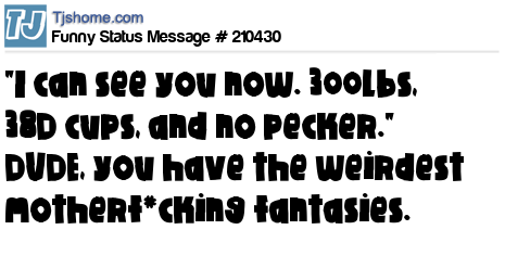 X is "I can see you now. 300lbs, 38D cups, and no pecker." DUDE, you have the weirdest motherf*cking fantasies.