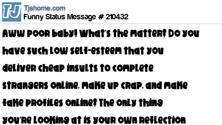 X is Aww poor baby! What's the matter? Do you have such low self-esteem that you deliver cheap insults to complete strangers online, make up crap, and make fake profiles online? The only thing you're looking at is your own reflection in the mirror.
