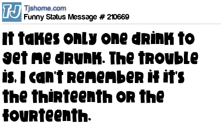 X says It takes only one drink to get me drunk. The trouble is, I can't remember if it's the thirteenth or the fourteenth.
