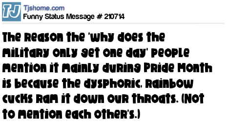 X says The reason the 'why does the military only get one day' people mention it mainly during Pride Month is because the dysphoric, rainbow cucks ram it down our throats. (Not to mention each other's.)