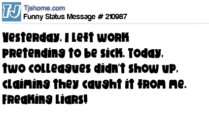 X is Yesterday, I left work pretending to be sick. Today, two colleagues didn't show up, claiming they caught it from me. Freaking liars!