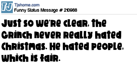 - # 190626 Just so we're clear, the Grinch never really hated Christmas. He hated people which is perfectly understandable.