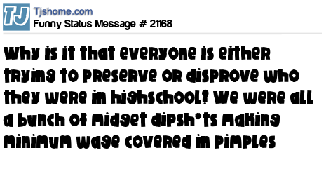 X Why is it that everyone is either trying to preserve or disprove who they were in highschool? We were all a bunch of midget dipsh*ts making minimum wage covered in pimples