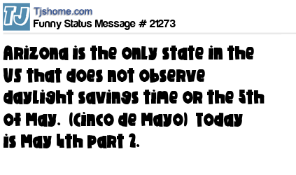 X says Arizona is the only state in the US that does not observe daylight savings time or the 5th of May. (Cinco de Mayo) Today is May 4th part 2.