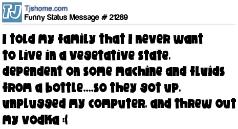 X is I told my family that I never want to live in a vegetative state, dependent on some machine and fluids from a bottle....so they got up, unplugged my computer, and threw out my vodka :(