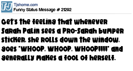 X get's the feeling that whenever Sarah Palin sees a Pro-Sarah bumper sticker, she rolls down the window, goes "WHOOP, WHOOP, WHOOP!!!!" and generally makes a fool of herself.