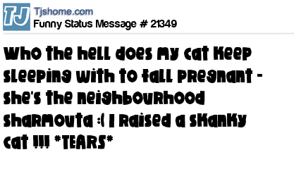 X says Who the hell does my cat keep sleeping with to fall pregnant - she's the neighbourhood sharmouta :( I raised a skanky cat !!! *TEARS*