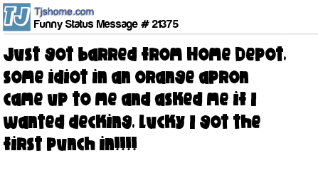 X just got barred from Home Depot, some idiot in an orange apron came up to me and asked me if I wanted decking, lucky I got the first punch in!!!!