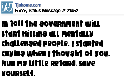 X In 2011 the government will start killing all mentally challenged people. I started crying when I thought of you. Run my little retard, save yourself.