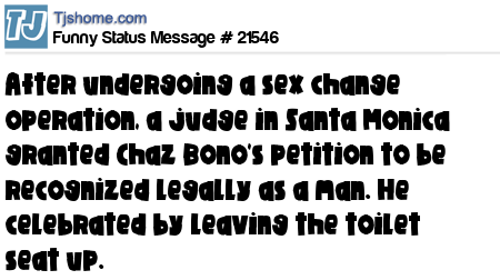 X After undergoing a sex change operation, a judge in Santa Monica granted Chaz Bono's petition to be recognized legally as a man. He celebrated by leaving the toilet seat up.