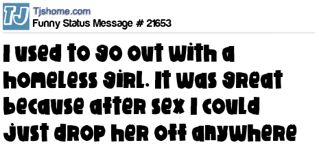 - # 89216 I once went on a date with a homeless girl... the only good thing about it was when the date was over I could just drop her off anywhere.