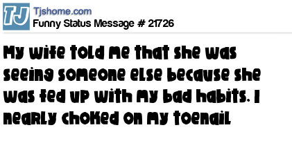 X says My wife told me that she was seeing someone else because she was fed up with my bad habits. I nearly choked on my toenail