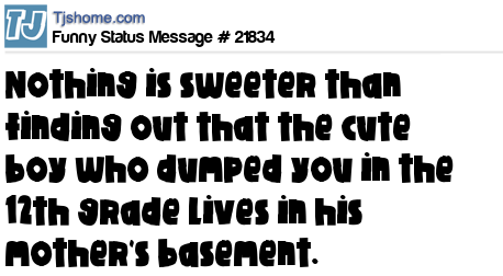 X says Nothing is sweeter than finding out that the cute boy who dumped you in the 12th grade lives in his mother's basement.
