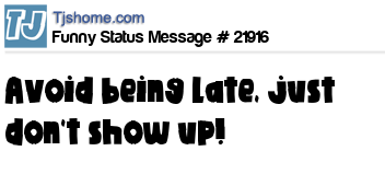 - # 179430 Late for work? Call your boss and tell him you're not coming. He will be so surprised when you show up that he'll forget you were late.