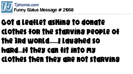 - # 39077 Earlier today I got a call from a charity asking me to donate some of my clothes to the starving people throughout the world.I told them to kiss my a$$. Anybody who fits into my clothes isn't starving..lol