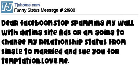X says dear facebook,stop spamming my wall with dating site Ads or am going to change my relationship status from single to married and sue you for temptation.love,me.