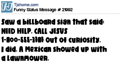 X saw a billboard sign that said: NEED HELP, CALL JESUS 1-800-555-3787 Out of curiosity, I did. A Mexican showed up with a lawnmower.