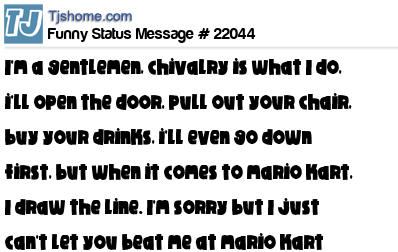 X says I'm a gentlemen, chivalry is what I do, i'll open the door, pull out your chair, buy your drinks, i'll even go down first, but when it comes to mario kart, I draw the line. I'm sorry but I just can't let you beat me at mario kart