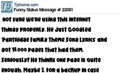X not sure we're using this internet thingy properly. He just Googled 'Partridge Family Theme Song Lyrics' and got 97,000 pages that had them. Seriously? He thinks one page is quite enough. Maybe 2, for a backup in case one goes down.